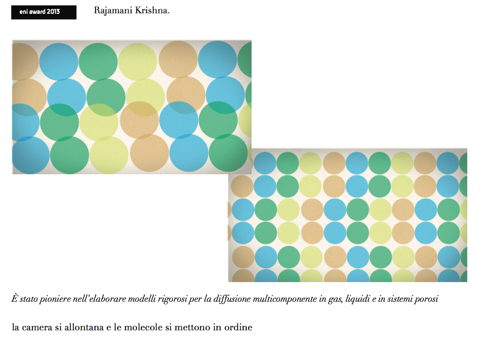 o un professore indiano (Rajamani Krishna) che ha scoperto come purificare i gas e rendere la benzina più efficiente; un ricercatore (Philip G. Jessop) che ha inventato un metodo per risolvere i disastri ambientali, purificando le acque contaminate da idrocarburi senza l'utilizzo di solventi organici; e infine due giovanissimi ricercatori italiani che hanno meno di 30 anni (Matteo Cargnello e Damiano Genovese) ma hanno già fatto numerose scoperte nel campo delle nanotecnologie?